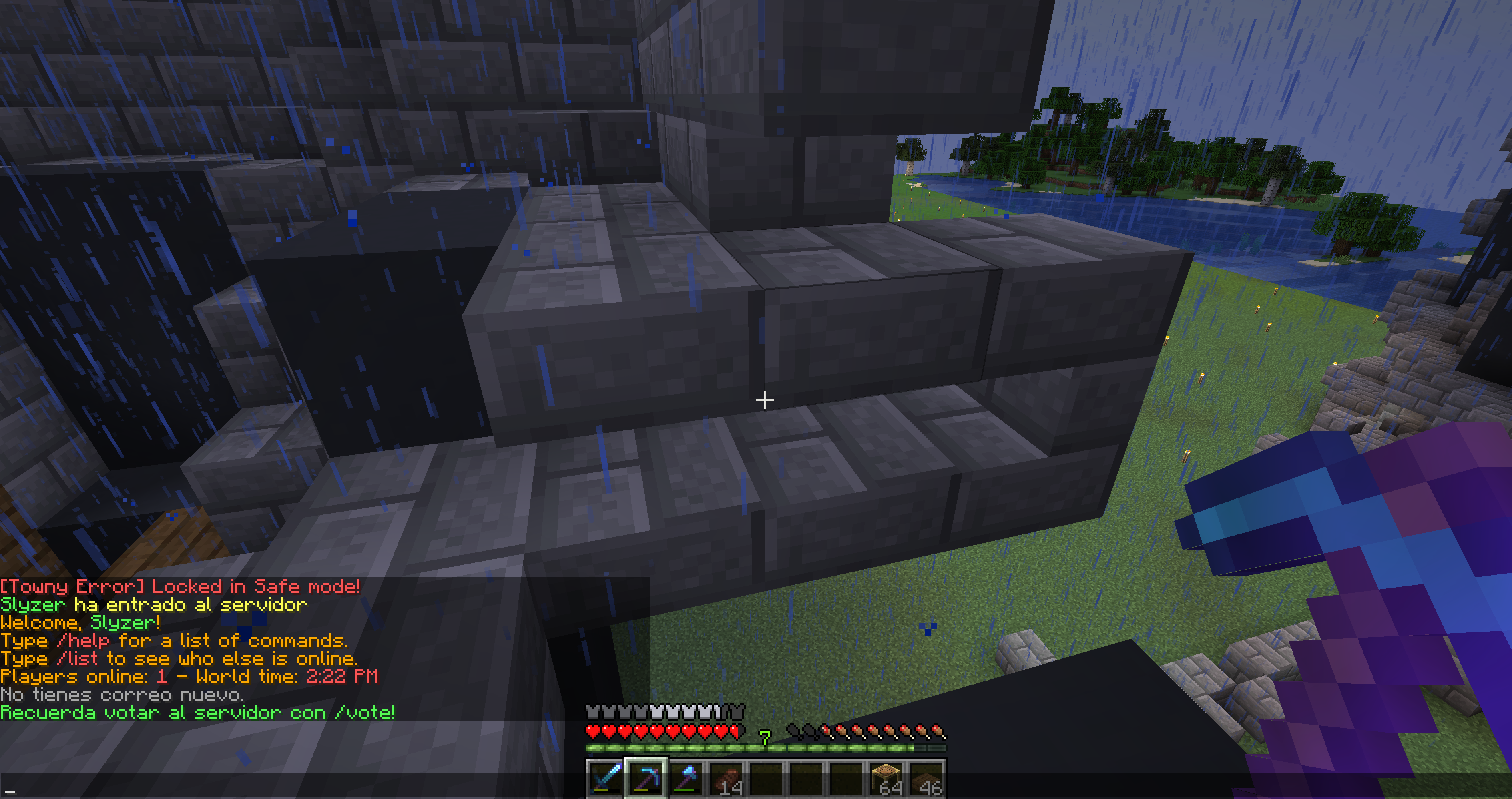 Buenas. Hoy, después del reinicio diario del servidor, me he conectado y no me puedo mover, ni teletransportarme, ni poner y ni quitar bloques. He notado que hay un error que dice: [Towny Error] Locked in Safe Mode. Espero se pueda resolver pronto.