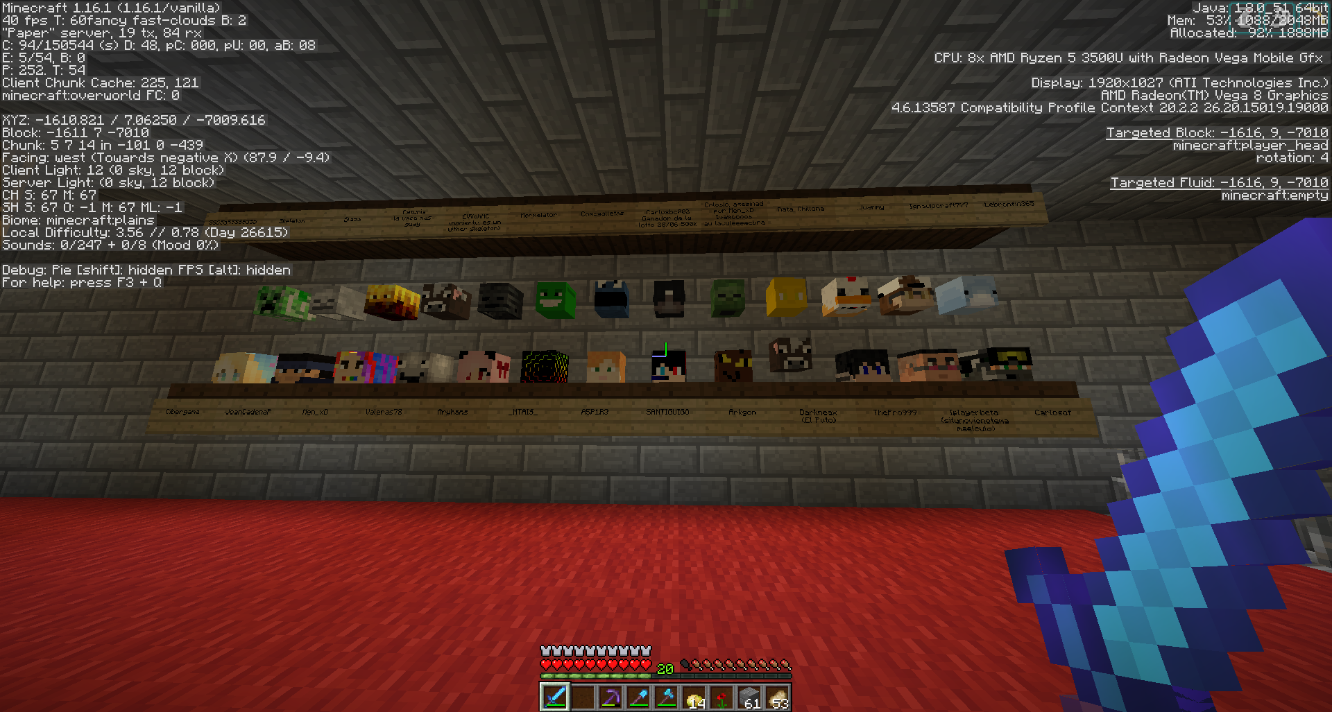 Buenas, quisiera reportar un bug, un tanto cuanto curioso, El dia de hoy invité a un par de amigos a mi casa, para que vieran la coleccion de cabezas que estoy empezando a forjar (si les interesa pertenecer envien /mail send herbross :'v ) y nos dimos cuenta de algo curioso, al dar click derecho sobre la cabeza de Darkneax aparecía la leyenda Cow (mobhunting reward), al quitarla para ver el nombre y esperando que al volverla a poner apareciera el nombre de Darkneax, se dropeó una cabeza de vaca, me gustaría ver si pudieran apoyarme a recuperar esa cabeza, porque el feo de dark me la vendió muy cara :'v porfis, los quiero, adjunto capturas de antes y despues y un video grabado en el momento curioso en el que cambia la cabeza