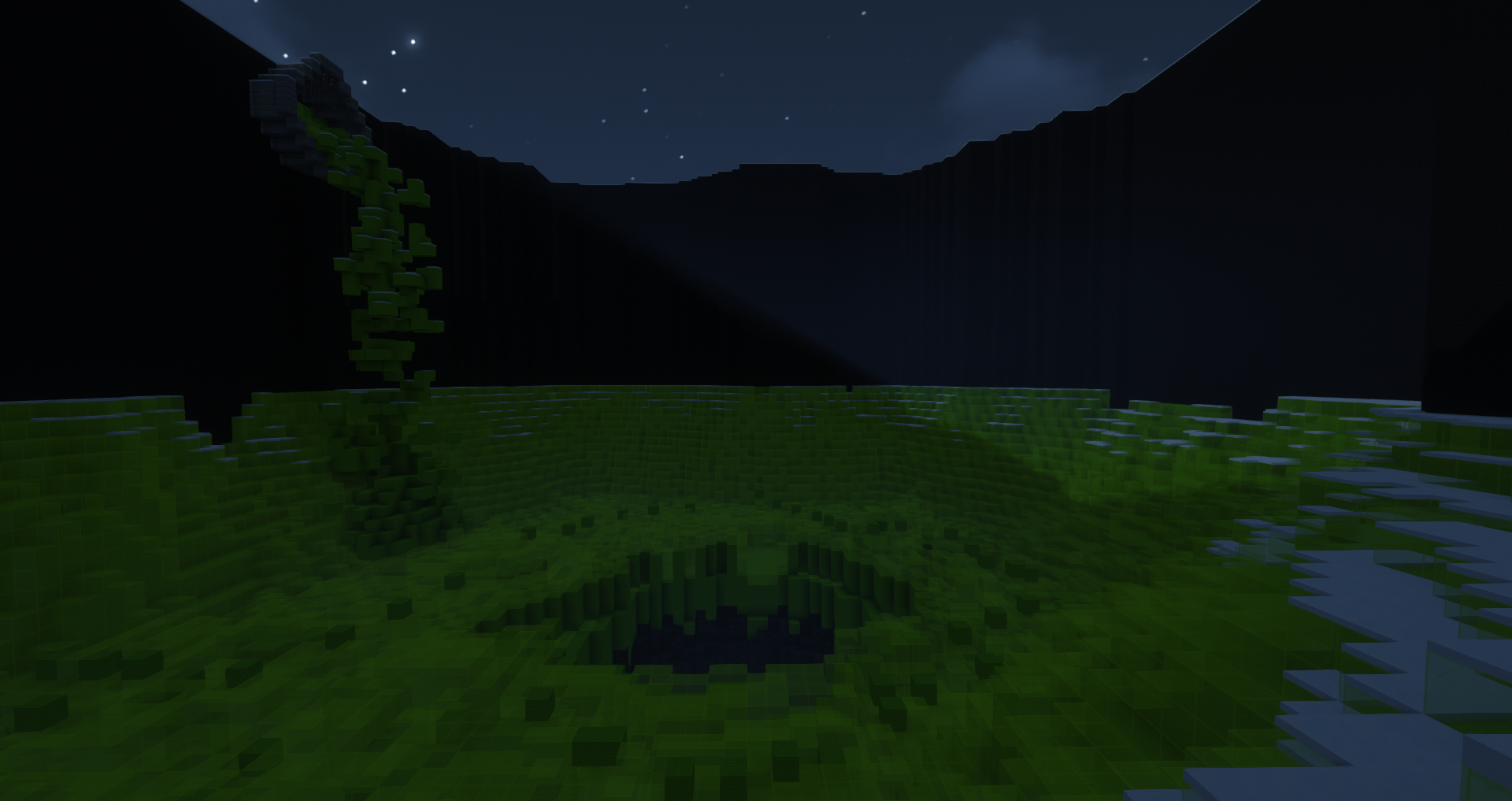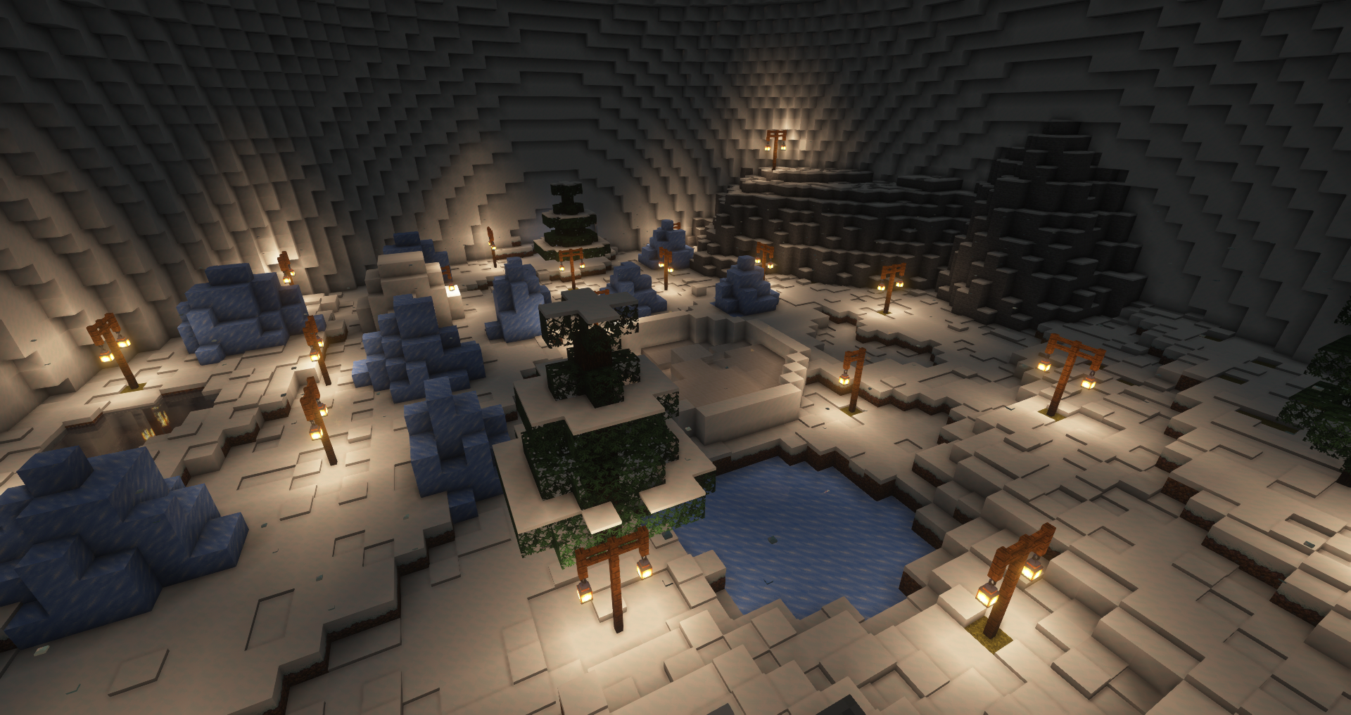 ➭ No sé como llamar a esto en verdad. Es algo que terraformé poniendo lana y luego cristal que le daba una textura extraña y chula. En su interior había un laberinto y al finalizarlo llegabas a un agujero. Cuelgo dos fotos de fuera y el interior del laberinto
