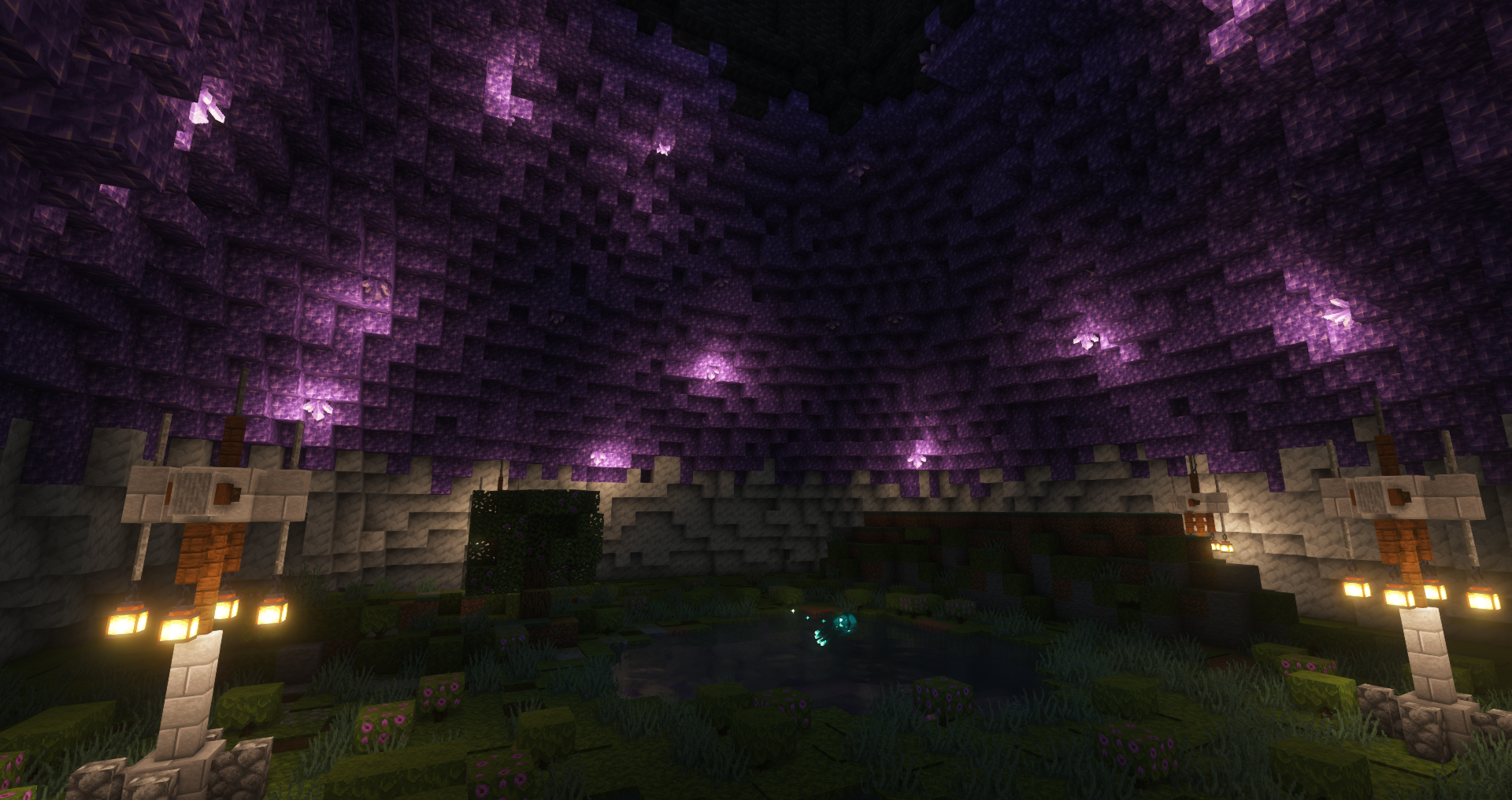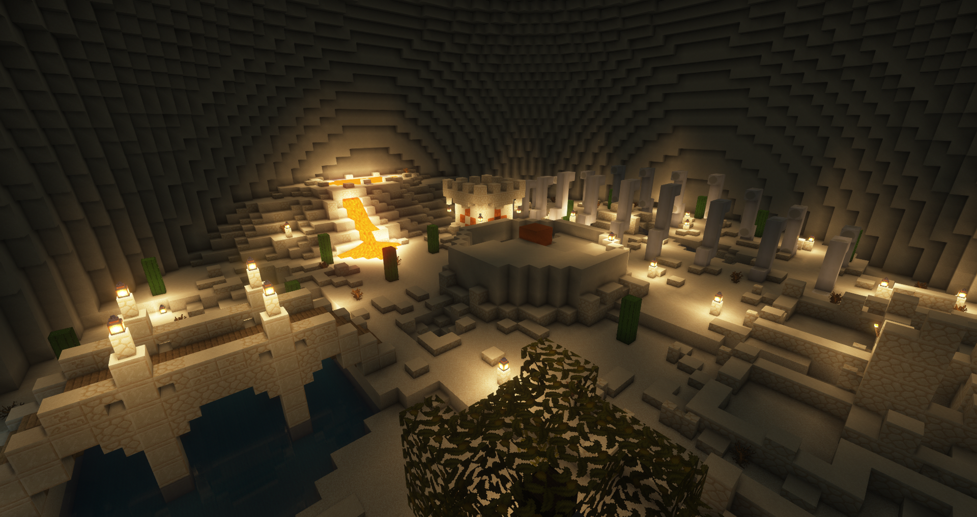➭ No sé como llamar a esto en verdad. Es algo que terraformé poniendo lana y luego cristal que le daba una textura extraña y chula. En su interior había un laberinto y al finalizarlo llegabas a un agujero. Cuelgo dos fotos de fuera y el interior del laberinto
