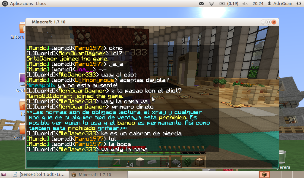 AleGamer333 es mi vecino (de la vida real) y esta enfadado conmigo por que según el yo destrocé nuestra casa de minecraft (fue el intentandome trollear) me echó la culpa a mi y ahora va por allí insultándome por las espaldas, mi amigo AdriGuanGaymer le a pillado en Mundo minecraft insultándome reiteradas veces, aquí tenéis la prueba: