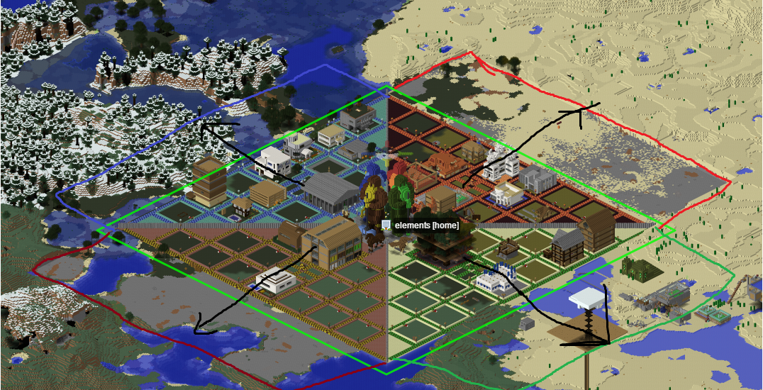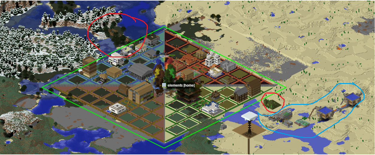 También quería preguntar, de una vez, de quien son las construcciones alrededor de la ciudad, una que me comprometo a trasladar y otra que es una edificación bastante rara y es obra de un jugador que no se conecta desde hace 1 año y 8 meses. Marcadas con dos círculos rojos, el circulo Azul es una propiedad de la ciudad (concretamente una granja de hierro construida por JoanMarcraft, LUIS_0357 y ThunderPower956, creo)