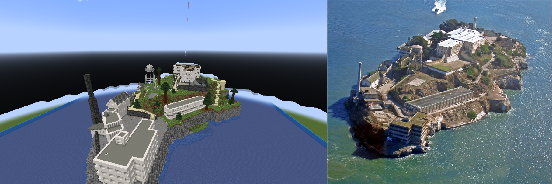 Des de un principio, decidí hacer Alcatraz (una copia intentando ser lo más fiel). A medida que iba avanzando, me fui dando cuenta que hacer una construcción de dicho calibre en un mes era una locura. Además, pasar algo real a Minecraft con todas sus limitaciones y cubos XD fue realmente tedioso. Tuve que buscar muchos modelos 3D así como mapas y alguna que otra película conocidilla. Quiero mostrarles parte por el foro, también la tenéis disponible en /warp carcel4.