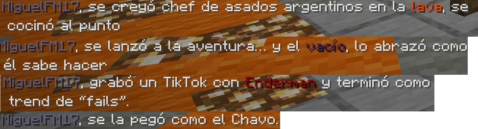 :diamante: Nos hemos puesto creativos y hemos actualizado los mensajes de muertes, haciendo referencias a memes actuales y cosas del estilo, además de haber cambiado el color de los mensajes, os pongo algún ejemplo, pero que decir, tendreis que morir para verlos todos. :slime: