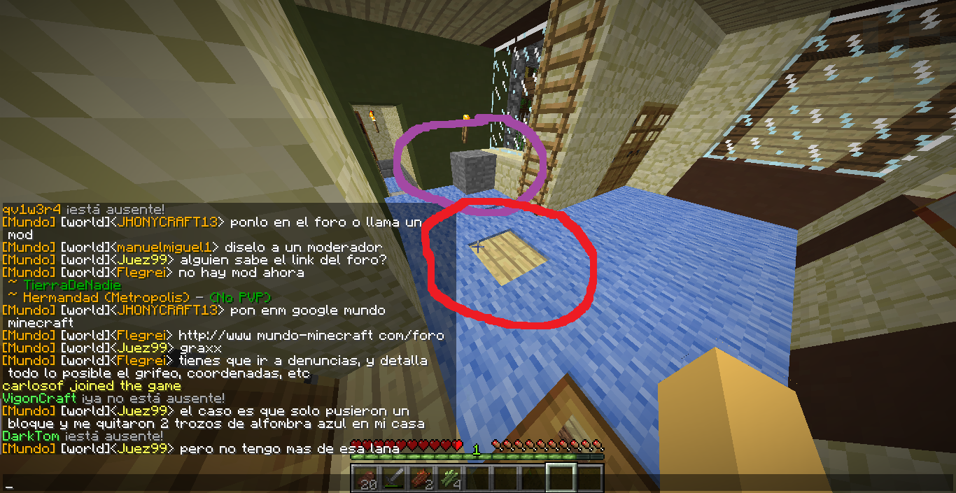 Hola, soy Juez99 y me han grifeado mi casa, a priori noto que hay un bloque de Stone que yo no recuerdo colocar y que me faltan 2 alfombras azul, faltan en uno en donde esta el bloque de Stone y el otro en mitad de la entrada no se por que :S