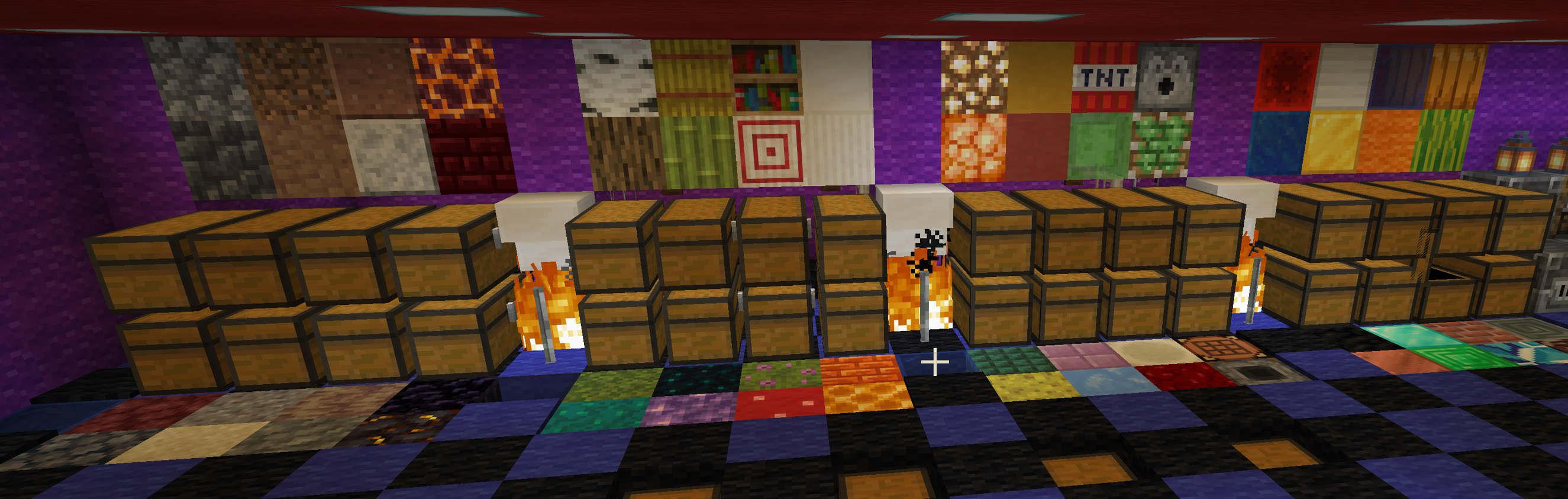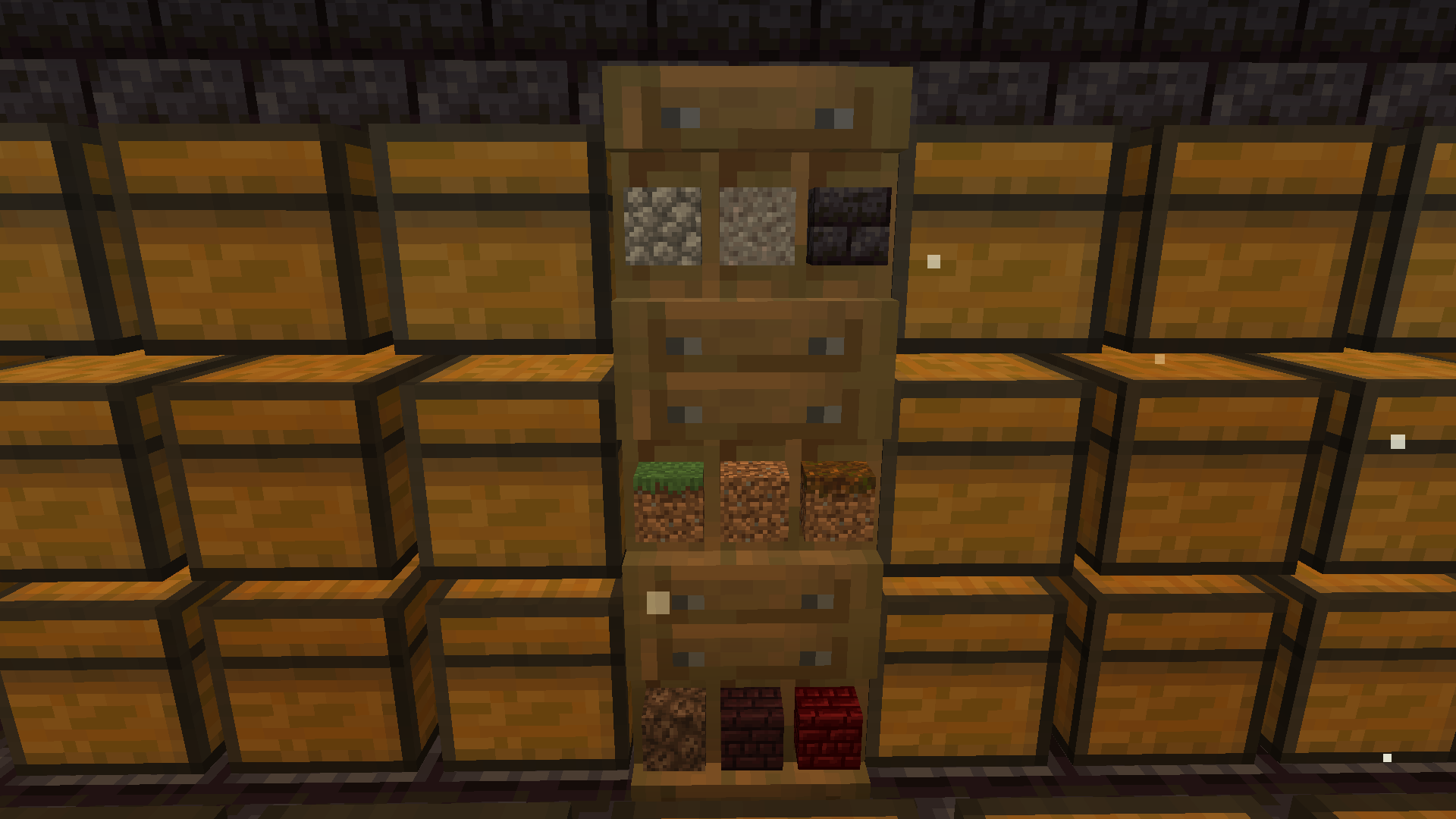 No uséis itemframes para decoración en los cofres, usad el nuevo bloque Shelf (la estantería nueva). De poner itemframes en vuestras casas que sean muy pocos. Ejemplo de cofres ordenados con itemframes y con las nuevas estanterías.