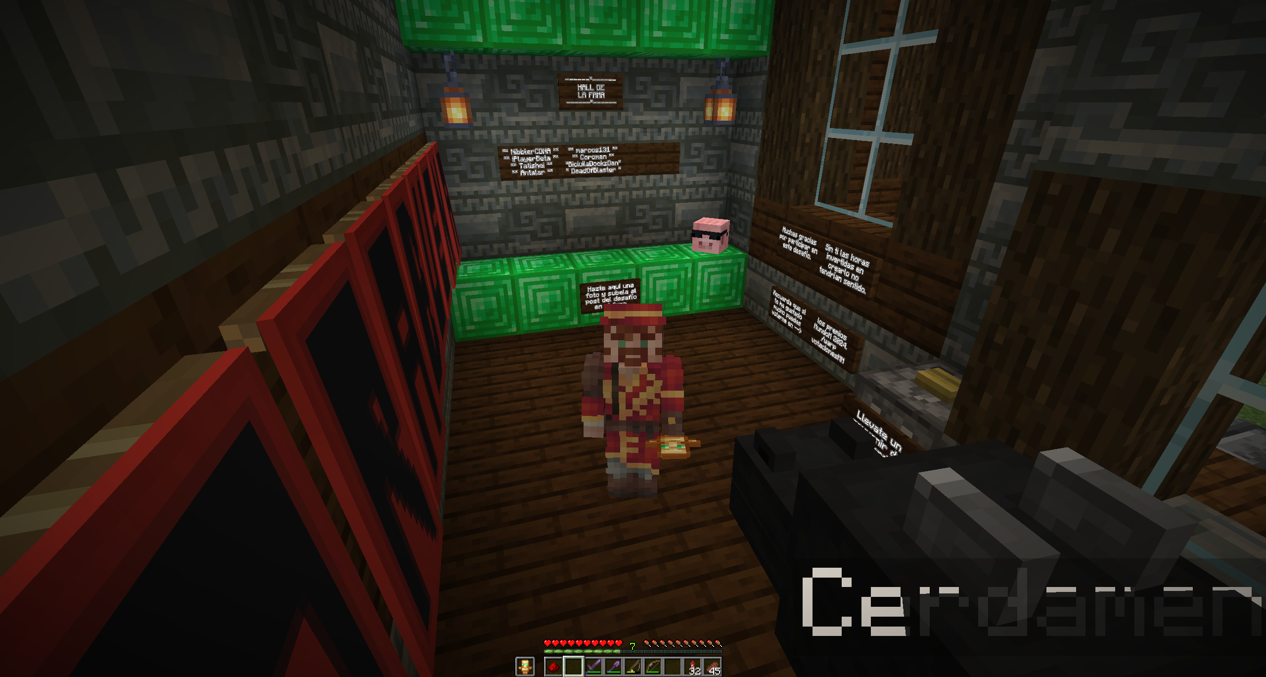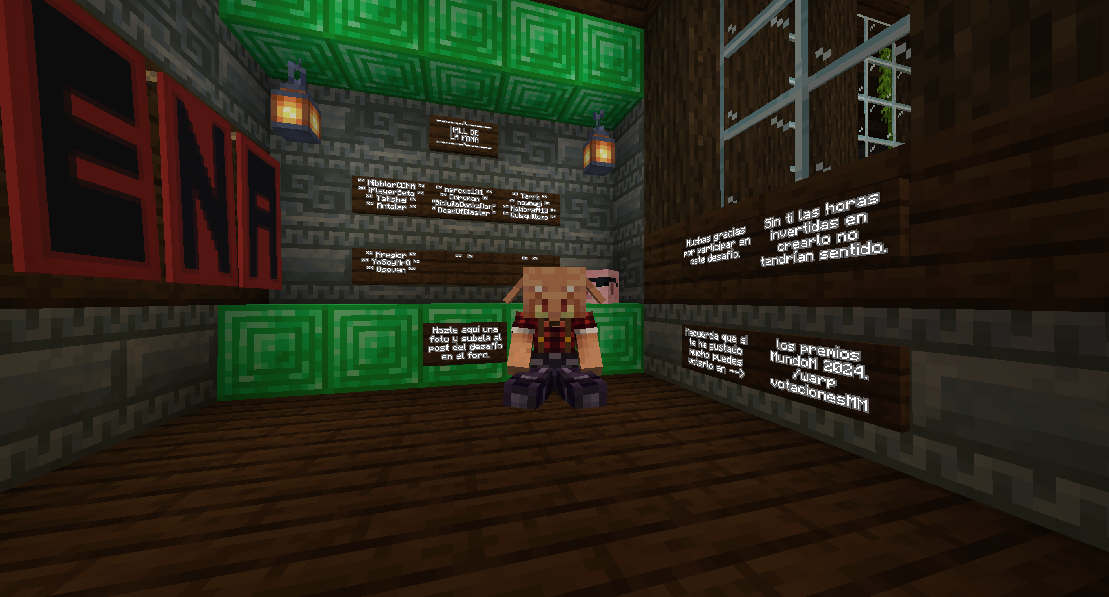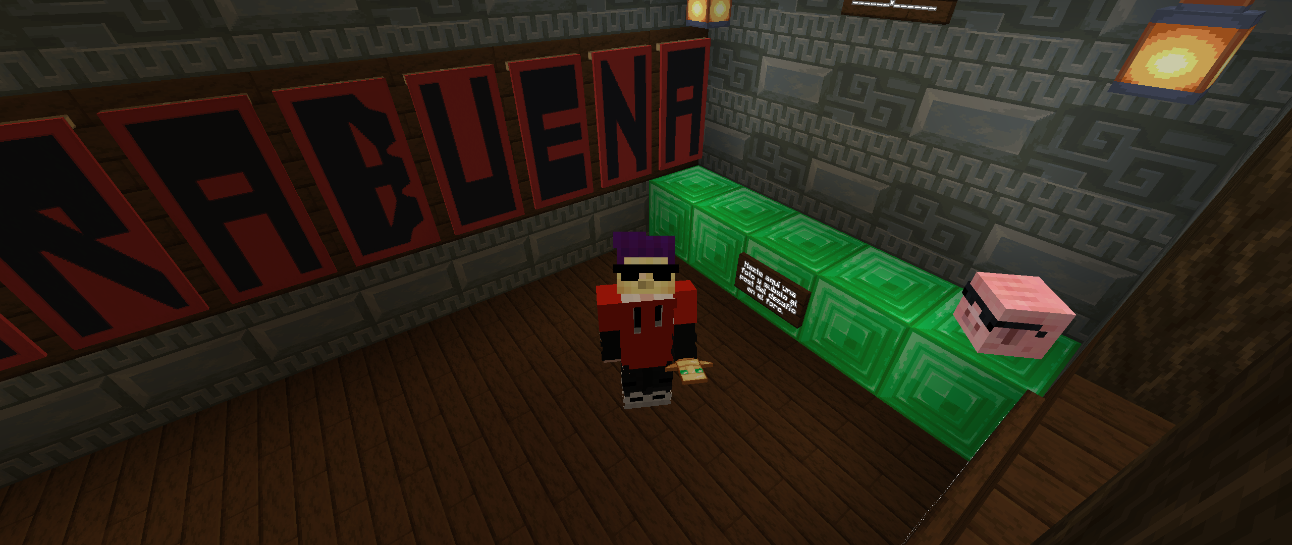 Buenas server, después de un largo tiempo de ausencia vuelvo para traeros un desafío que pondrá a prueba vuestra habilidad, inteligencia, perseverancia y conocimientos. Se trata de una mansión con 10 salas que deberéis completar resolviendo distintos puzles y desafíos. Está todo completamente automatizado con redstone así lo que no necesitáis que esté yo allí para jugarlo. Es un reto individual por lo que NO podéis venir en grupo, si ya hay alguien en la mansión tendréis que volver mas tarde o esperar a que el que va por delante haya resuelto ya al menos 5 salas. Si aceptáis el reto podéis venir escribiendo "/warp cerdorojo" o para los mas survival cogiendo el metro oeste (el azul) ya que está a unos 700m del /spawn por lo que se llega en un minuto.