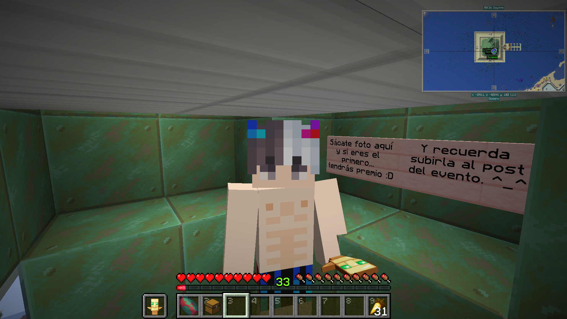 *- MiniEvento "Preguntas y respuestas", empezará 21:15(Tiempo modificable dependiente del evento anterior), Evento en discord, donde os haré unas preguntas sobre zonas del parque acuático y cosas del mapa, así que mientras vais buscando cabezas y disfrutando de los eventos, estad atentos a cada cosa que veáis.
