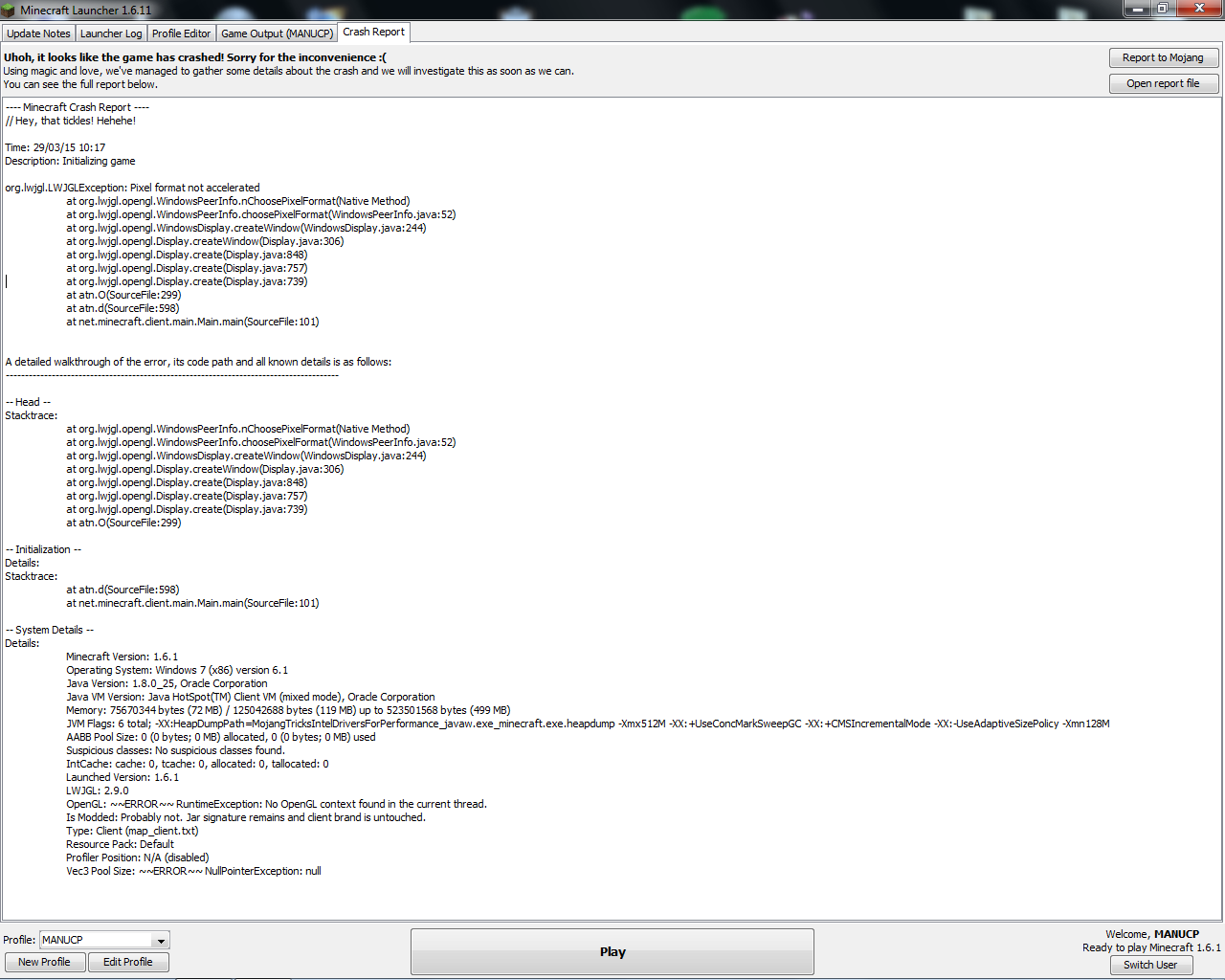 org.lwjgl.LWJGL.Exception: Pixel format not accelerated