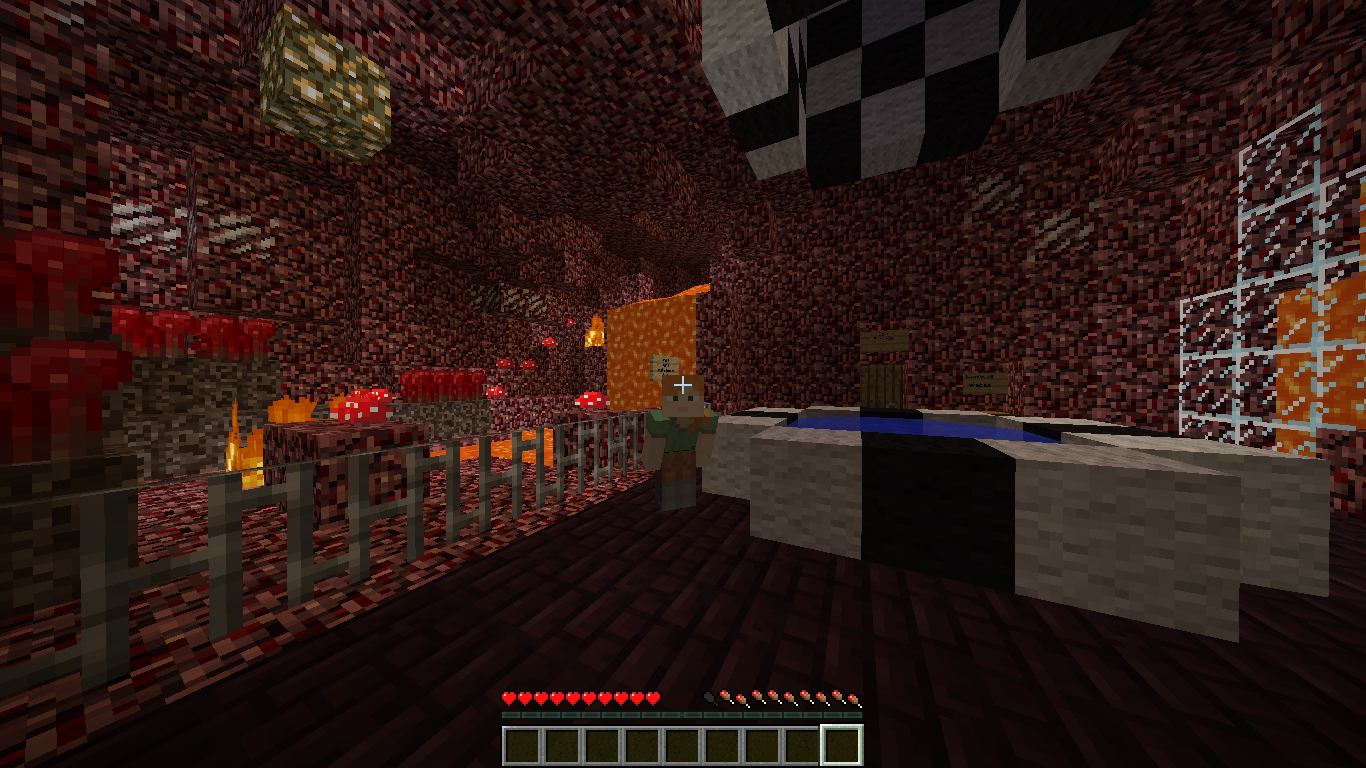 Seguridad: Es un salto de precisión. Hay que dejarse caer por la trampilla y no tocar ninguna tecla de movimiento que pueda desviar al PJ de su ruta. Sí se puede utilizar diferentes vistas. Para salir del la sala "del cochón" usa un /tw saltobase, algún home o el del /spawn porque la sala carece de salida directa a la superficie.