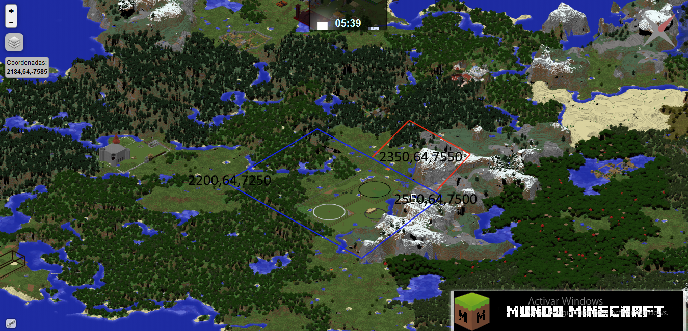 La zona necesaria para este proyecto sería aproximadamente de 350 x 250, en el rectángulo que forman las coordenadas 2200, 64, 7250 y 2550, 64, 7500 aprox. (la imagen 3 muestra la zona actual de las torres, con los 3 círculos hechos que marcan la base de la estructura de cada una de ellas, la primera blanca, la segunda negra y la tercera gris con mi actual casa en medio donde guardo los materiales jajajajaja). Ampliable a la zona que rodea a las coordenadas 2350, 64, 7550, donde colocaría ese mini pueblecito del que os hablaba al principio, entre la explanada y utilizando también la montaña. La imágen 4 muestra lo que sería las dos zonas que necesitaría aprox., la de las torres con sus jardines (rectángulo azul) y la del pueblecito (rectángulo rojo).