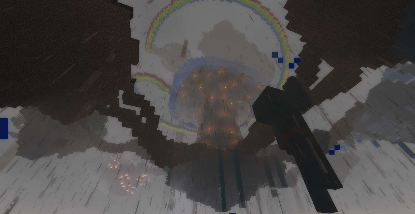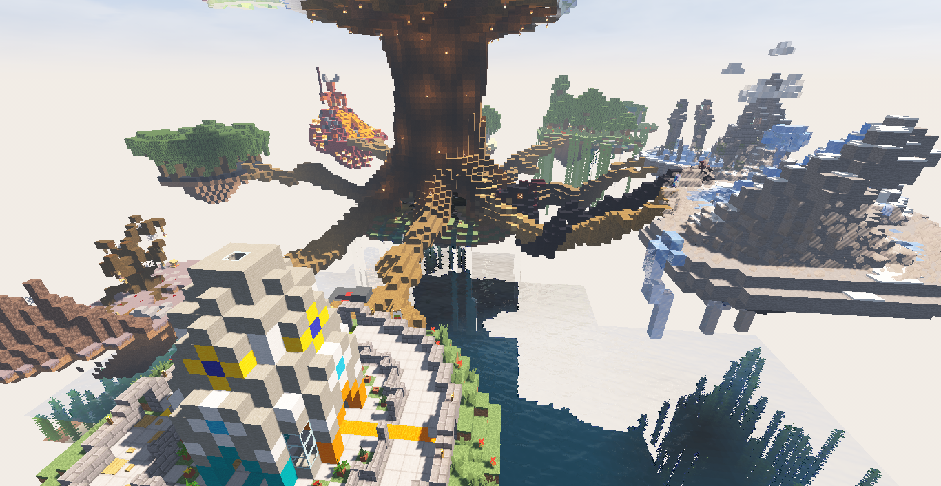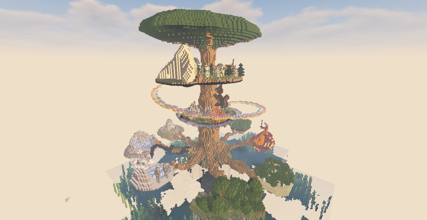 Asgard quedaría en la parte alta del tronco, Midgard justo debajo y a través de 8 raíces los otros mundos en forma de pequeñas islas con detalles de éstos, hay uno extra que ya veréis cual es.. Apareceríamos debajo de sus raíces donde queda la fuente que llena el pozo del conocimiento, con espacio para pasearse y sentarse admirando los mundos. Para llegar a cada mundo se caminaría por la raíz que toque y para llegar hasta Midgard se subiría por la escalera de caracol, luego a Asgard desde Bifröst. En la raíz del Niflheim estaría el dragón (serpiente-dragón) Nidhogg, a lo largo del tronco la ardilla Ratatösk y en la cima Vedrfölnir no podré hacerlo porque no se llega a ver.