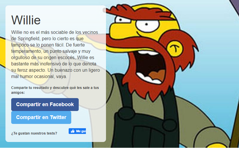podeis comprobar quien sois aqui https://pandemicquiz.com/es/q/answer/que-personaje-de-los-simpsons-eres#.X8qwXTHPw_6Si, es una chorrada pero yo soy willie