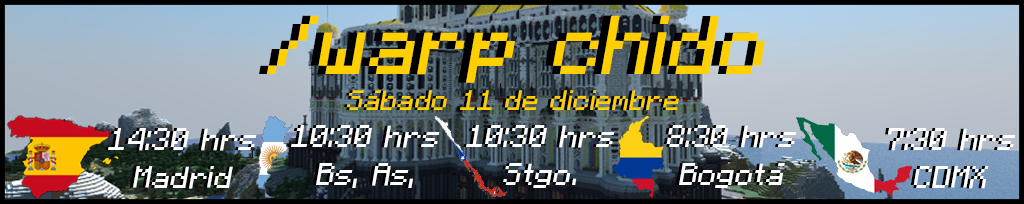 Verán que se llevará a cabo en el /warp chido, el día SÁBADO 11 DE DICIEMBRE a las 14:30 Horas de España, Madrid, los horarios de otros países se encuentran en el banner siguiente: