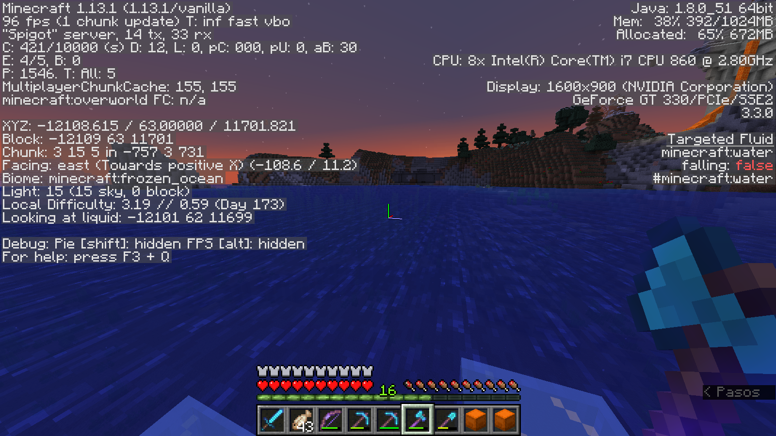 En esta ocasión me encontré una cosa muy chula y muy rara a la vez; Un stronghold acuático, si si, lo que vieron. Resulta que mientras exploraba, me encontré esta generación to' rara, y lo mejor de todo es que no estaba raideado, así que podría decirse que ya solo quedan 2 strongholds sin explorar (porque esta ya lo recorrí de arriba a abajo por todo el LOOOT!). Aquí van las fotos del suceso.
