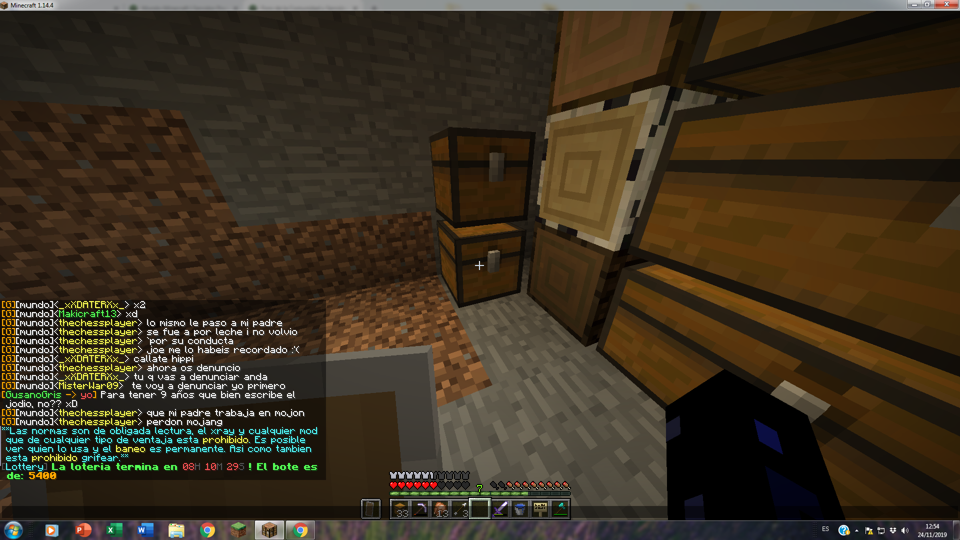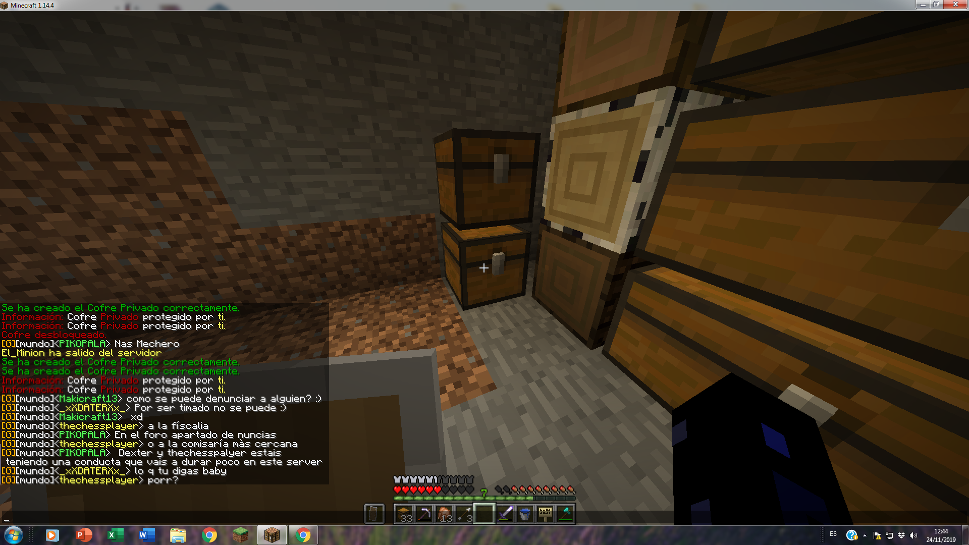 Por la tarde, un vecino nuestro, nos dijo que cuidado , que hay quejas de nosotros. Lo cual tambien nos dió la opción de jugar a Anarquia (que no nos gusta el tema de robar/que nos roben, pero si que haya un ambiente un poco con "humor" o algo de "tensión"). Dicha queja nos hizo reflexionar, y probablemente vayamos a jugar un poco de vez en cuando (cuando queramos tener dicho"humor") y jugar mas tranquilos y amigables en este servidor (El survival).