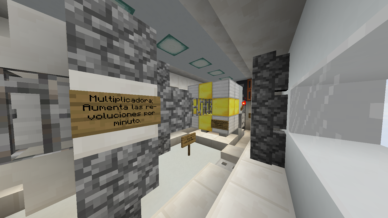 Ademas, como no quería que la construcción solo fuera una estructura, le hice la "decoración" interior, para que se pudiera notar algunos aspectos mecánicos de este tipo de producción energética. No solo con eso, intente poner la descripción breve y el nombre de las partes del sistema. No pude poner todos los que quería (Mas que nada porque Minecraft no me da las opciones creativas para hacerlo), pero al menos se tienen los aspectos básicos.