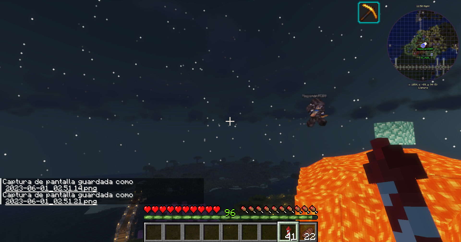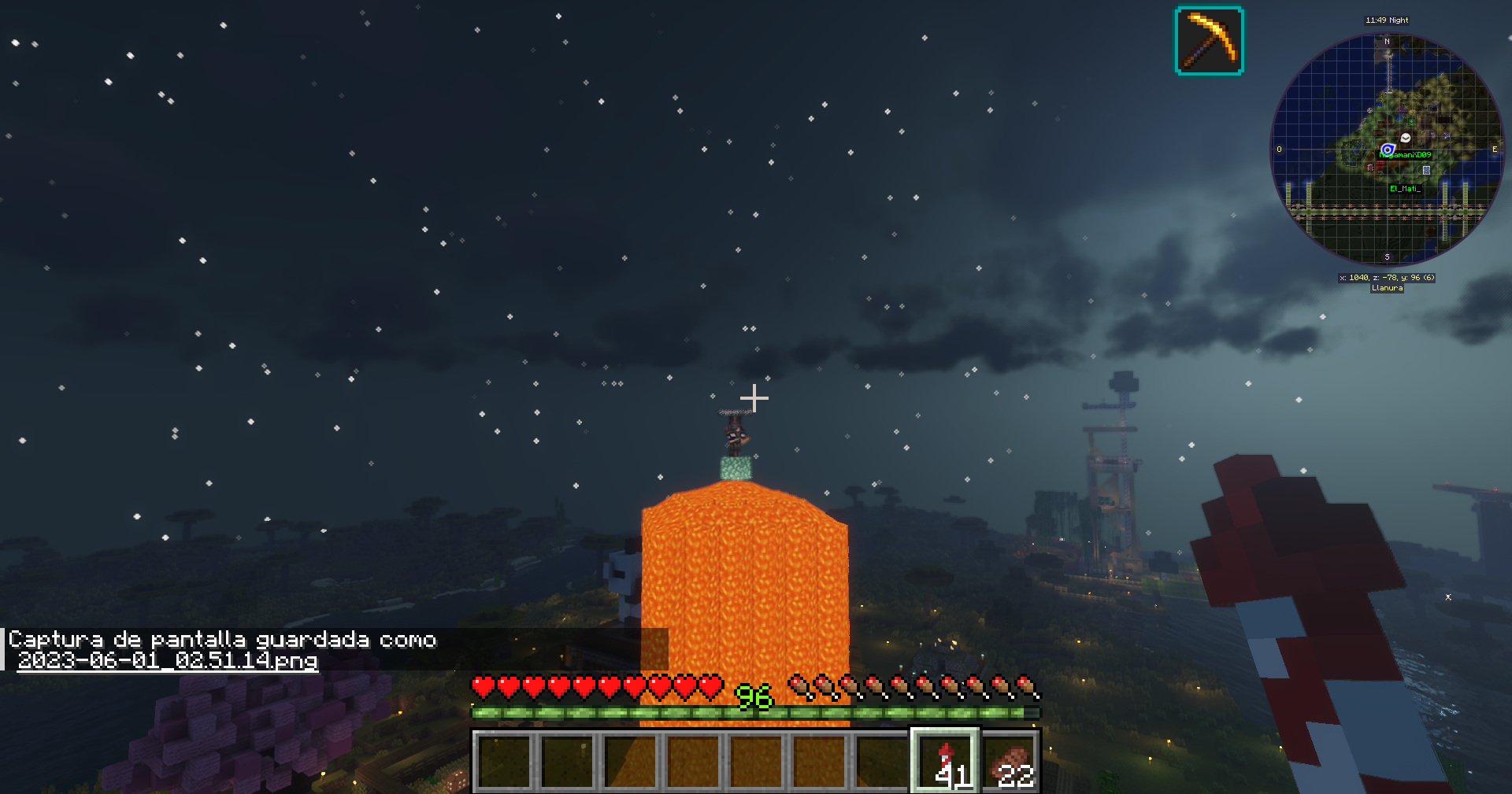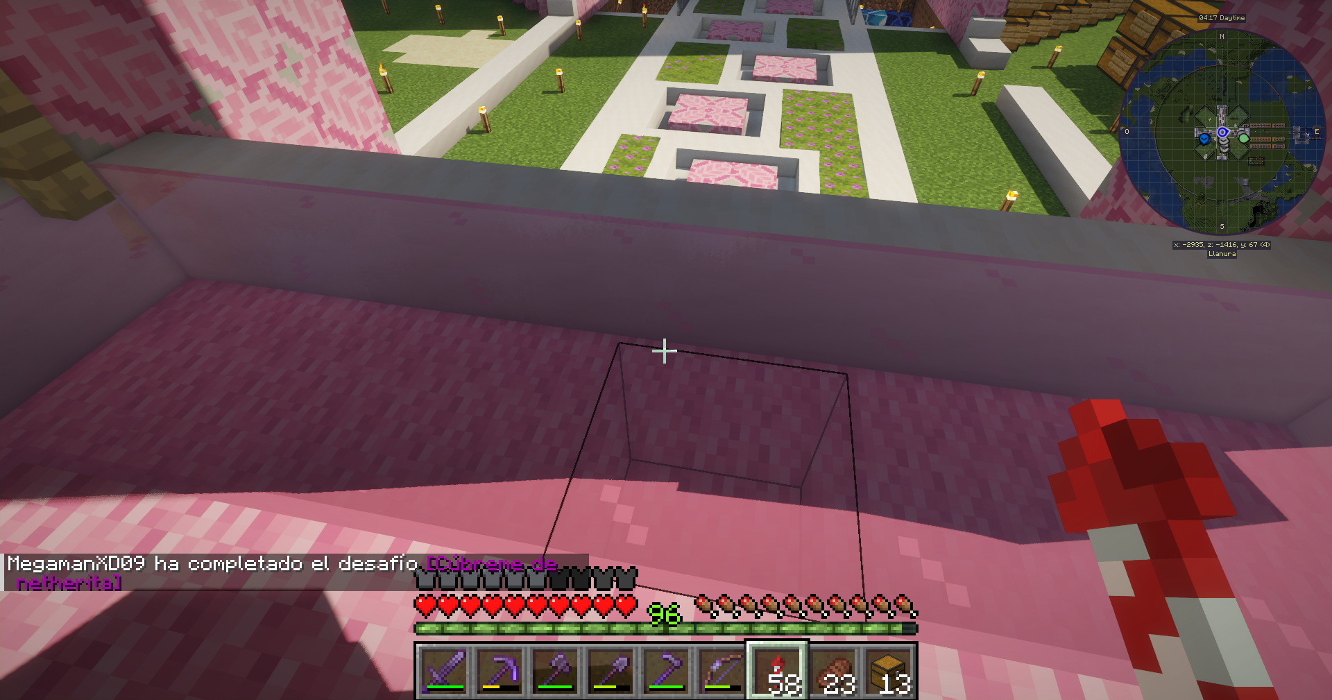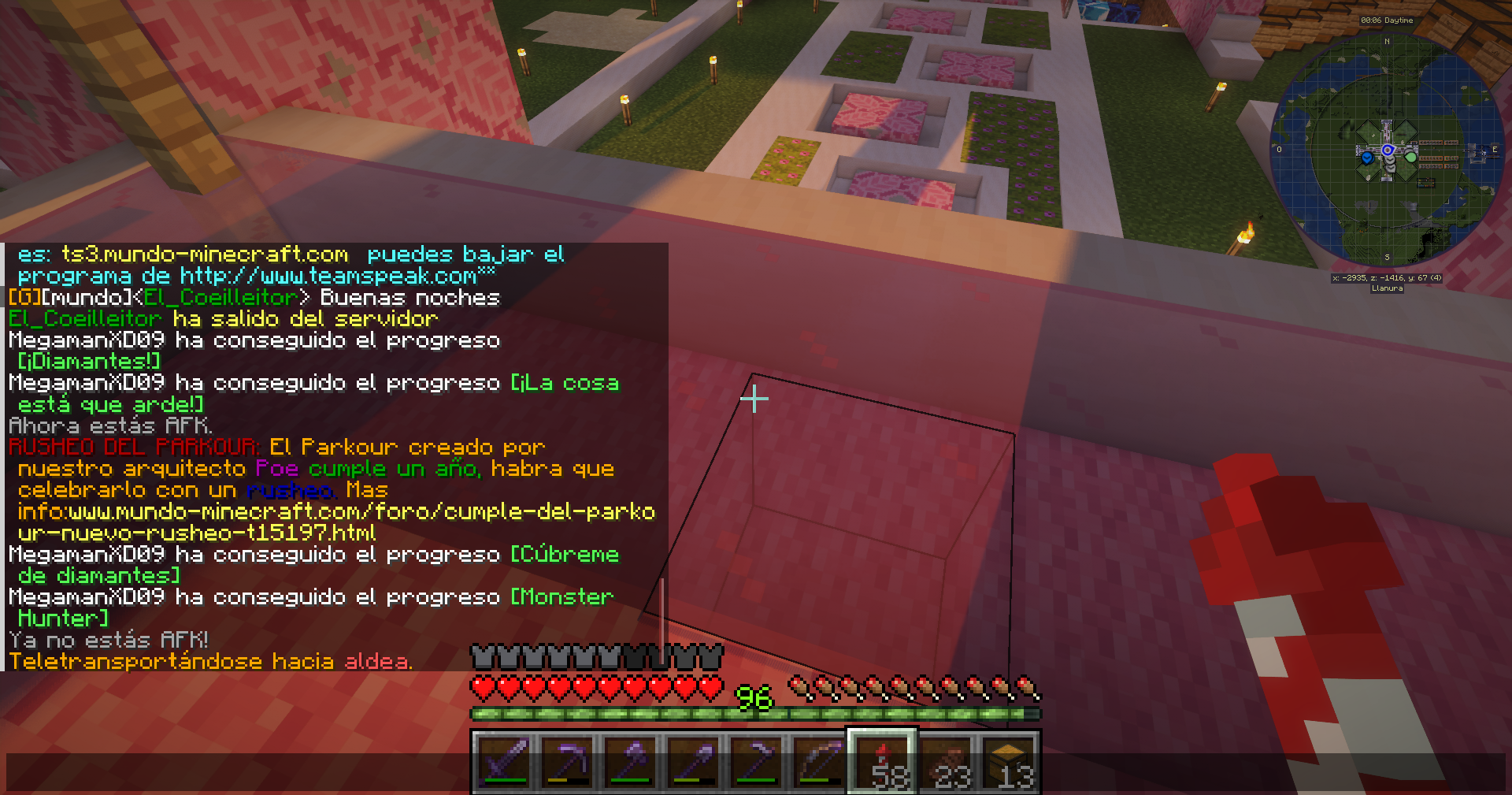 Hoy entro un usuario nuevo, tras saludarlo como hago normalmente, empieza ha conseguir logros algo extraños para el tiempo que lleva, a los 10 minutos, consiguió el logro cúbreme de netherita... sin pisar el nether, dejo aquí las capturas para que investiguen y vayan a casa de Sarinscita ya que fue directo a su casa, ha puesto lava, agua y no se si habrá robado o matado entidades, tiene fly y seguramente creativo, intente que parara pero solo se rio, adjunto captura