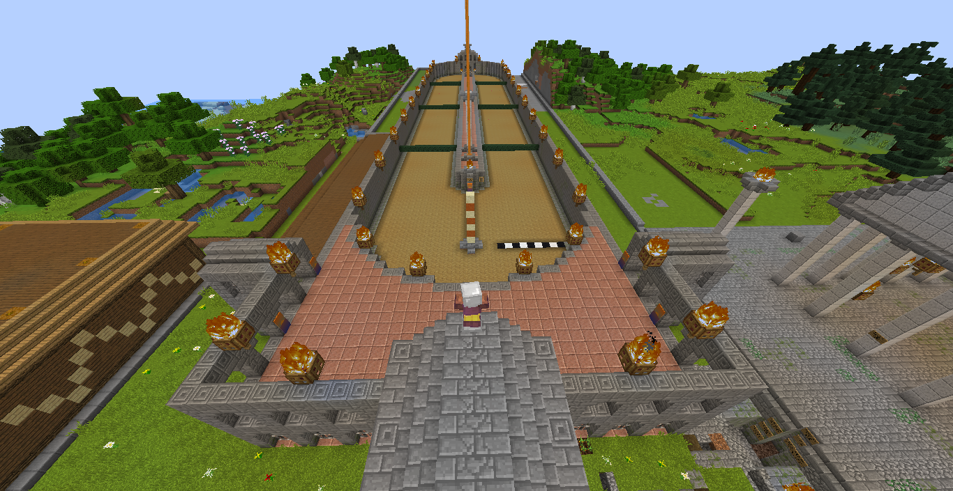 - Al Fondo Sur, adyacente a la entrada a la zona arqueológica se halla el acceso a las Salas Vips de aldeanos seleccionados para comerciar, Están a la disposición de los jugadores varios bibliotecarios, herreros y granjeros para cambiar comida por esmeraldas. En la entrada existe una máquina automatizada que a cambio de dos diamantes te suministra tres esmeraldas para que puedas comerciar con los bibliotecarios y herreros si no dispones de las esmeraldas suficientes.