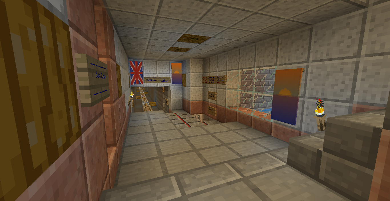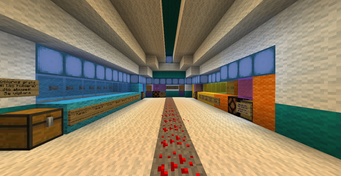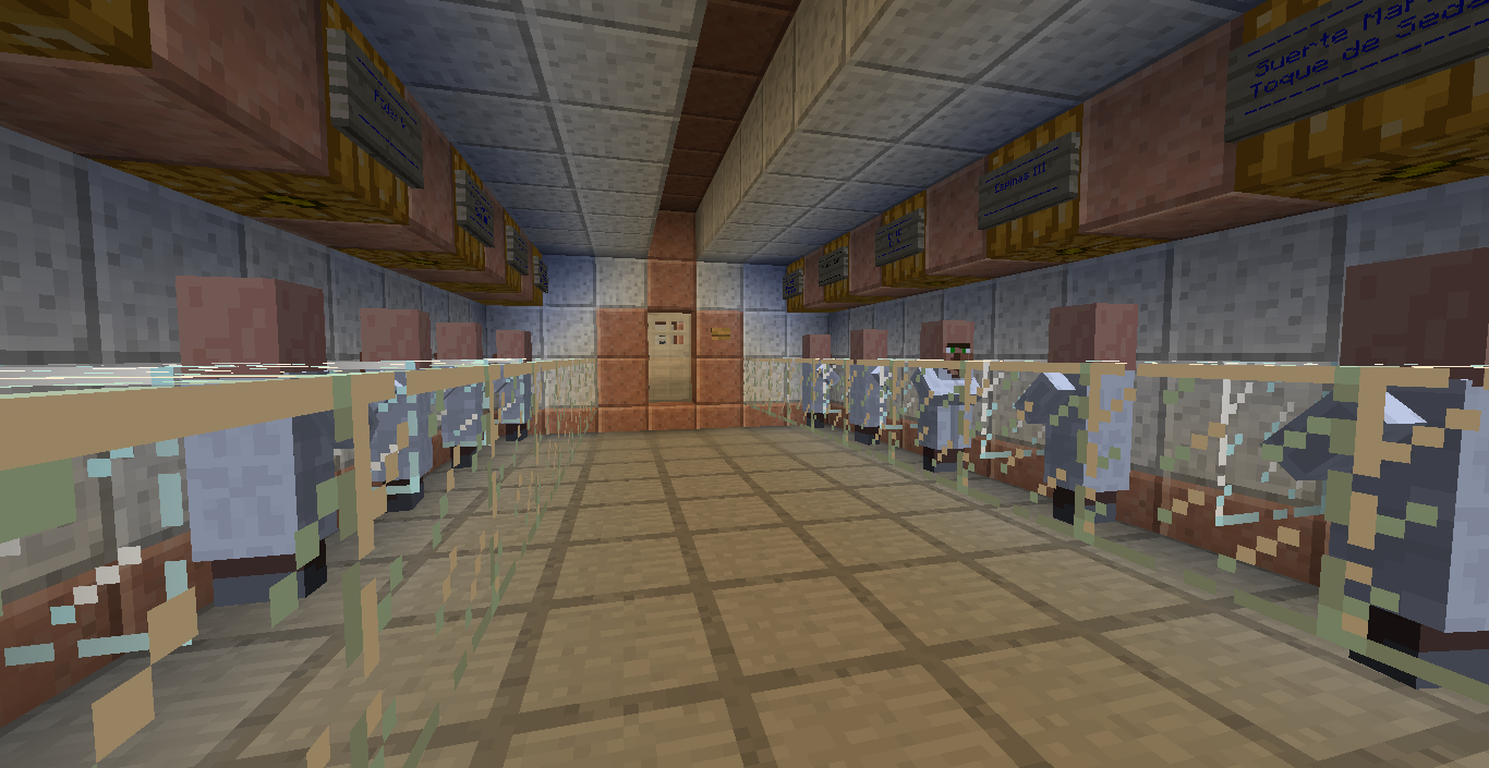 - Al Sur y a la derecha de la carnicería está la biblioteca. Contiene una mesa de encantamiento nivel 30 y una máquina automática la cual a cambio de dos lingotes de oro te proporciona una libro y tres lapislázuli para ser usado con la mesa si no tuvieras.