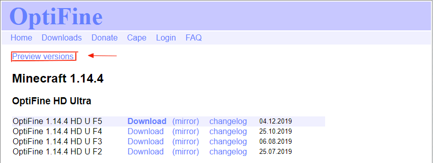 1º.- Una vez dentro de la página de descargas de OptiFine (enlace arriba) tenéis que clickar el apartado que dice ''Preview Versions".